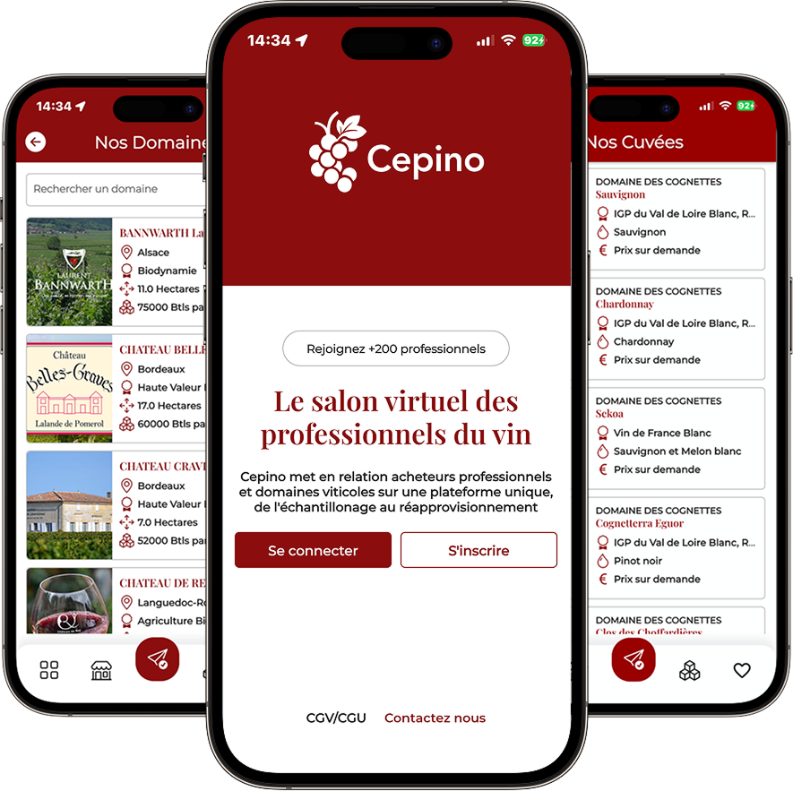 Que vous soyez producteur cherchant à élargir votre réseau de distribution ou acheteur en quête de nouveaux domaines, Cepino s'adapte à vos besoins pour faciliter vos échanges professionnels dans le secteur du vin.